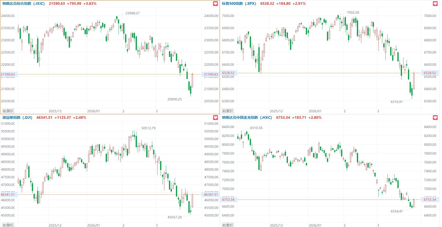 美伊均释放停战信号,市场憧憬双方部署停火;美股三大指数大幅收涨并创下去年5月以来最大单日涨幅,纳指涨3.83%,标普500指数涨2.91%,道指涨2.49%。月线方面配资导航网,纳指本月仍累计下跌4.75%,标普500指数累跌5.09%,道指累跌5.38%。
